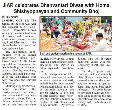 Jammu Institute of Ayurveda and Research (JIAR) celebrated Dhanvantari Diwas with great devotion and enthusiasm on the campus. The celebration began with a sacred Dhanvantari Homa, invoking the blessings of Lord Dhanvantari — the divine physician and symbol of health and healing. Faculty members, students, and staff participated in the rituals with deep reverence.