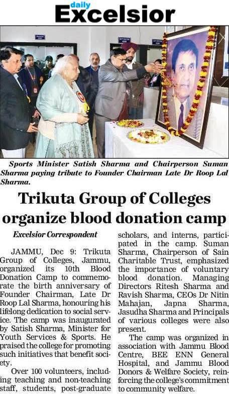 Trikuta Group of Colleges, Jammu, organized 10th Blood Donation Camp to mark the birth anniversary of its Founder Chairman, Late Dr. Roop Lal Sharma. The event was held to pay respect to his inspiring leadership and his lifelong dedication toward social service and humanitarian work.