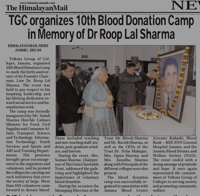 Trikuta Group of Colleges, Jammu, organized 10th Blood Donation Camp to mark the birth anniversary of its Founder Chairman, Late Dr. Roop Lal Sharma. The event was held to pay respect to his inspiring leadership and his lifelong dedication toward social service and humanitarian work.