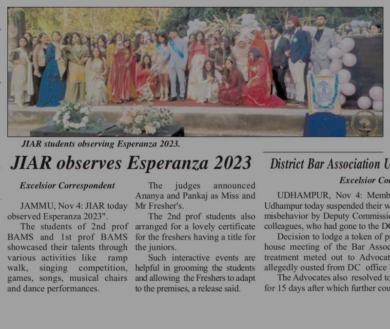 JIAR celebrates FRESHERS DAY Esperanza 2023”.The students of 2nd prof BAMS and 1st prof BAMS showcased their talents through various activities like ramp walk,singing competition, games, songs,musical chairs and dance performances .The judges announced Miss Ananya Gupta and Mr.Pankaj as Miss and Mr Fresher's. The 2nd Prof Students also arranged for a lovely certificate for the freshers having a title for the juniors. Such interactive events are helpful in grooming the students and allowing the Freshers to adapt to the premises .